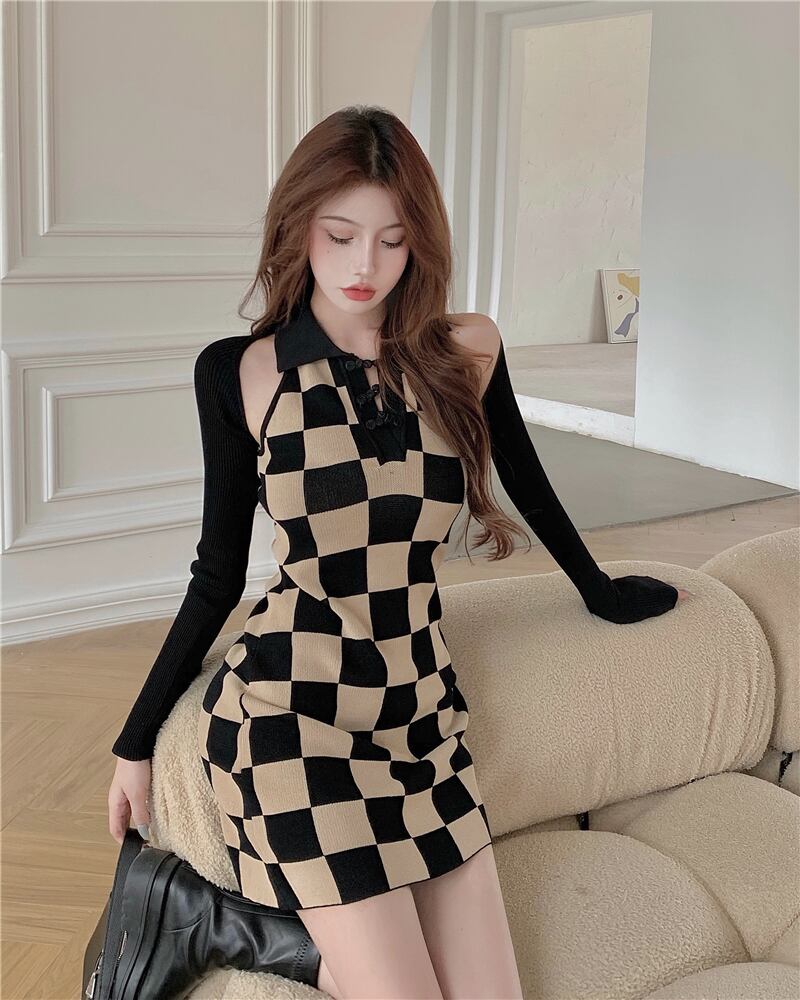 2021年秋新しい女性の香港フレーバーセクシーなストラップレスレトロチェッカーボード格子ニット偽のツーピースドレス micat39273901879