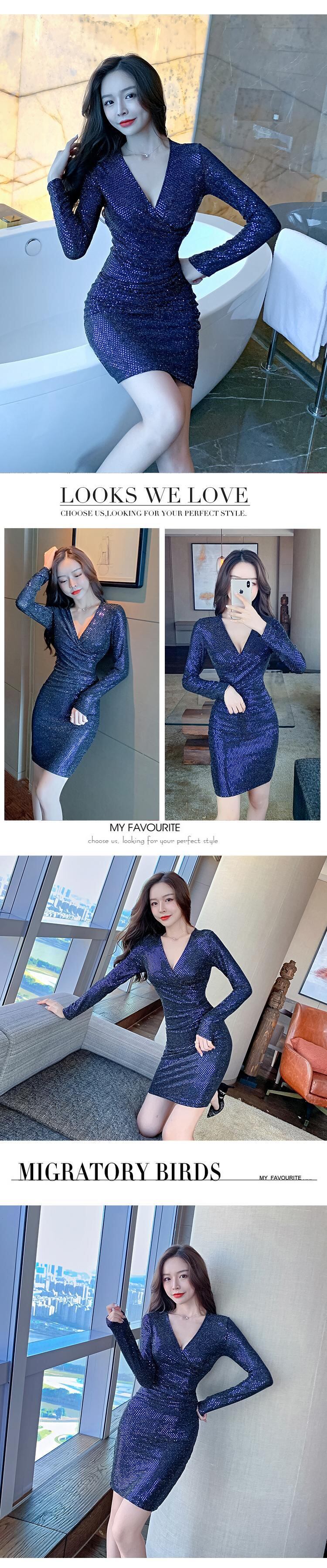 ナイトクラブレディースストアバーナイトワーク服作業服セクシーなローカットVネック長袖スパンコールドレス micat81203816526