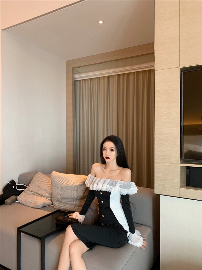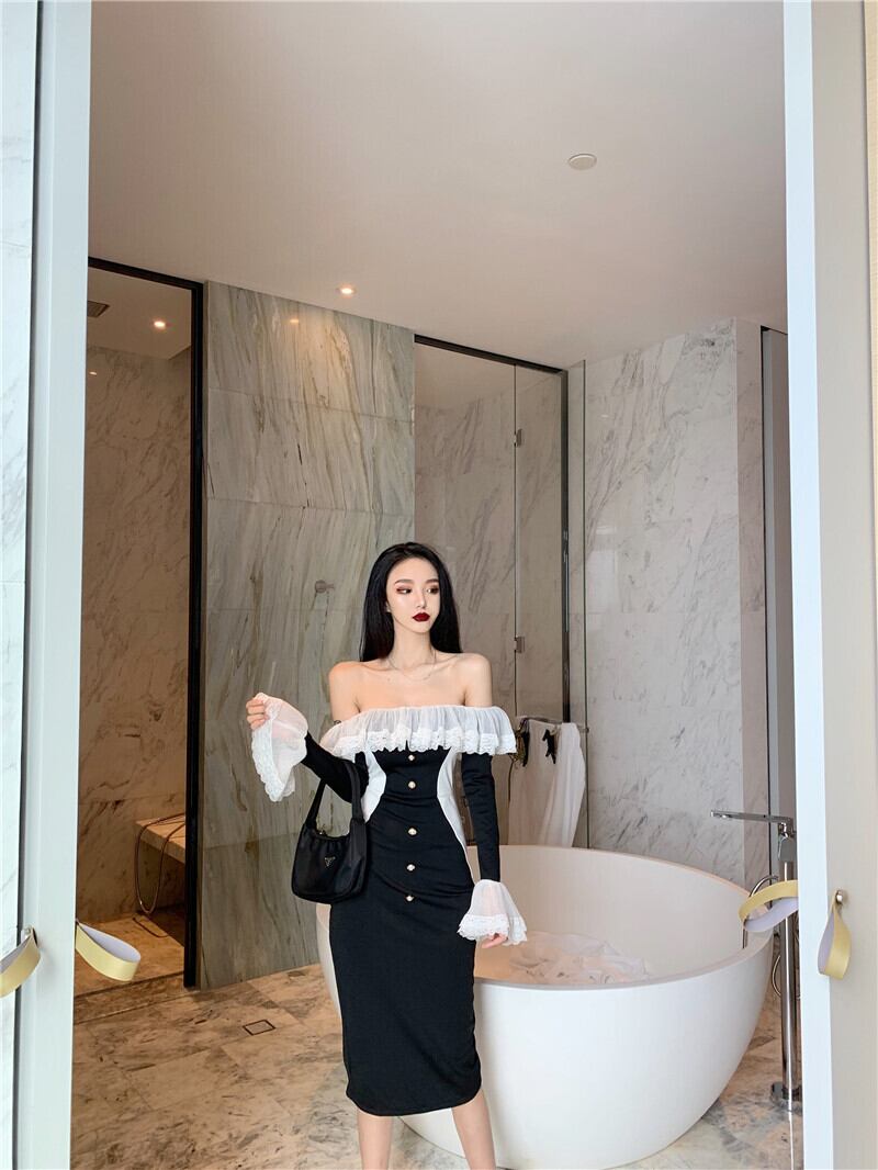イブニングドレス女性のパーティーレトロなフランスの気質セクシーなワンショルダースーパーフェアリートランペットスリーブミドル丈ドレス micat84260061763