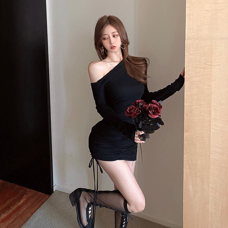 初秋の服2021新しい女性インターネット有名人アンカーファッションセクシーな斜めの襟長袖バッグヒップワンショルダーオフショルダードレス micat85195703435