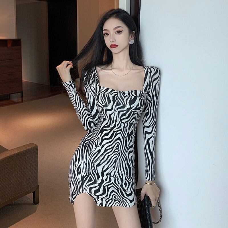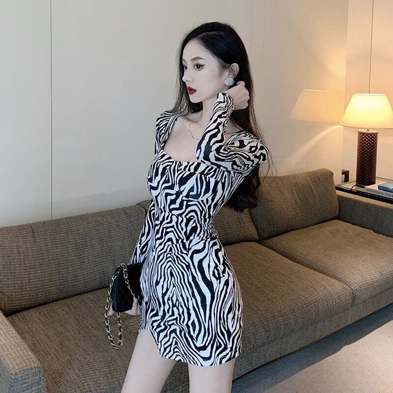 2021年秋新しい女性のポートスタイルのレトロなゼブラプリントセクシーなスクエアネックバッグヒップボトミングドレス micat22771607295
