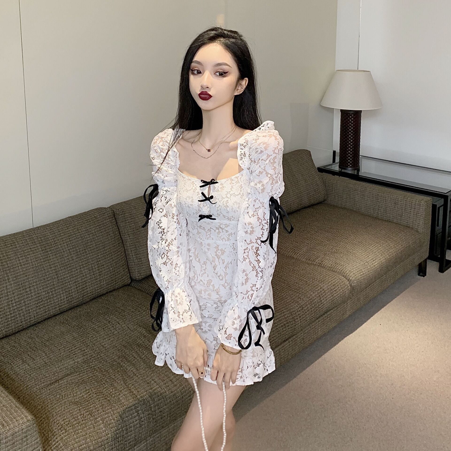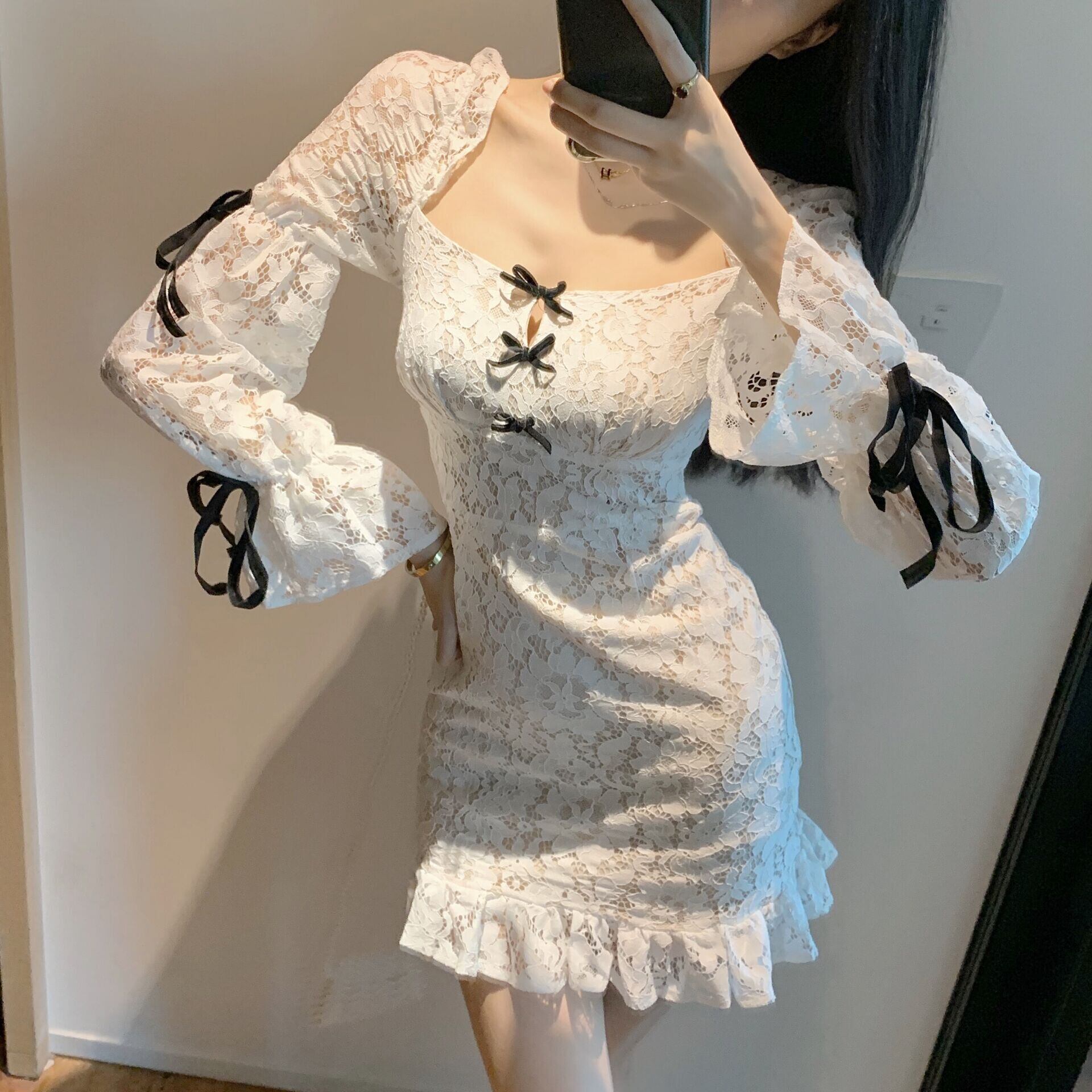フレンチミニドレスショートスーパーフェアリーネットセレブアンカーセクシースクエアネックパフスリーブレーススリムフィットヒップドレス micat40023895013