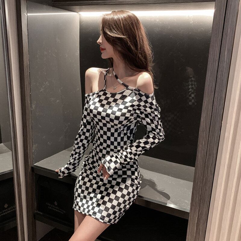 秋の婦人服2021年新しいネットセレブアンカーチェッカーボードチェック柄セクシーな斜めの襟オフショルダーベルベットハンギングネックドレス micat77572720008