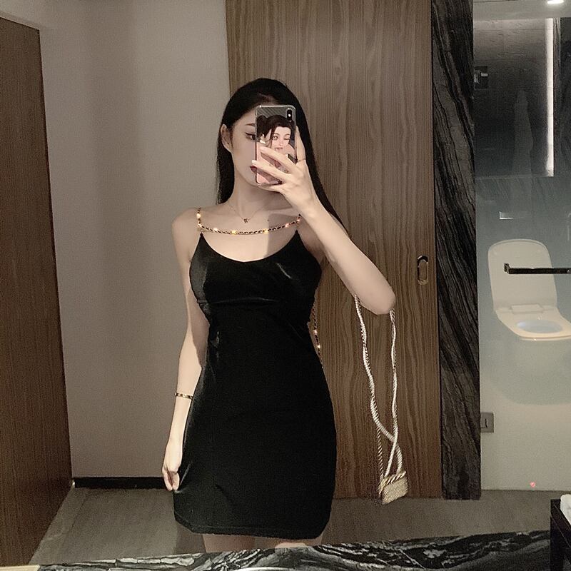 ナイトクラブの女性のイブニングドレスショートバンケット気質セクシーなスリムバッグヒップゴールドベルベットサスペンダードレス micat99640589650