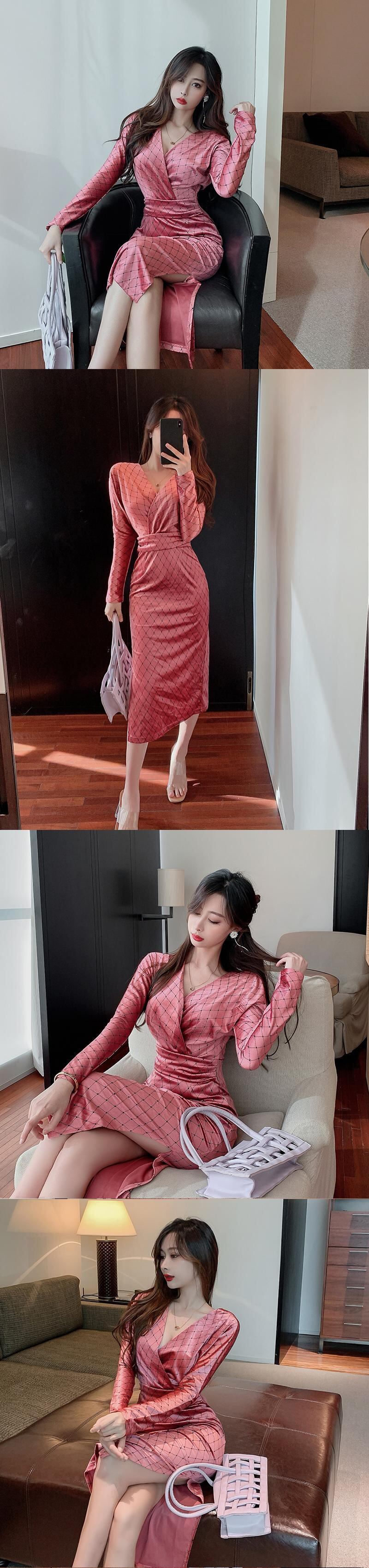 成熟したロイヤルシスタースタイルの女性の秋と冬の高レベルの社交界の名士の気質セクシーなVネックミドル丈チェック柄ドレス micat54252185458