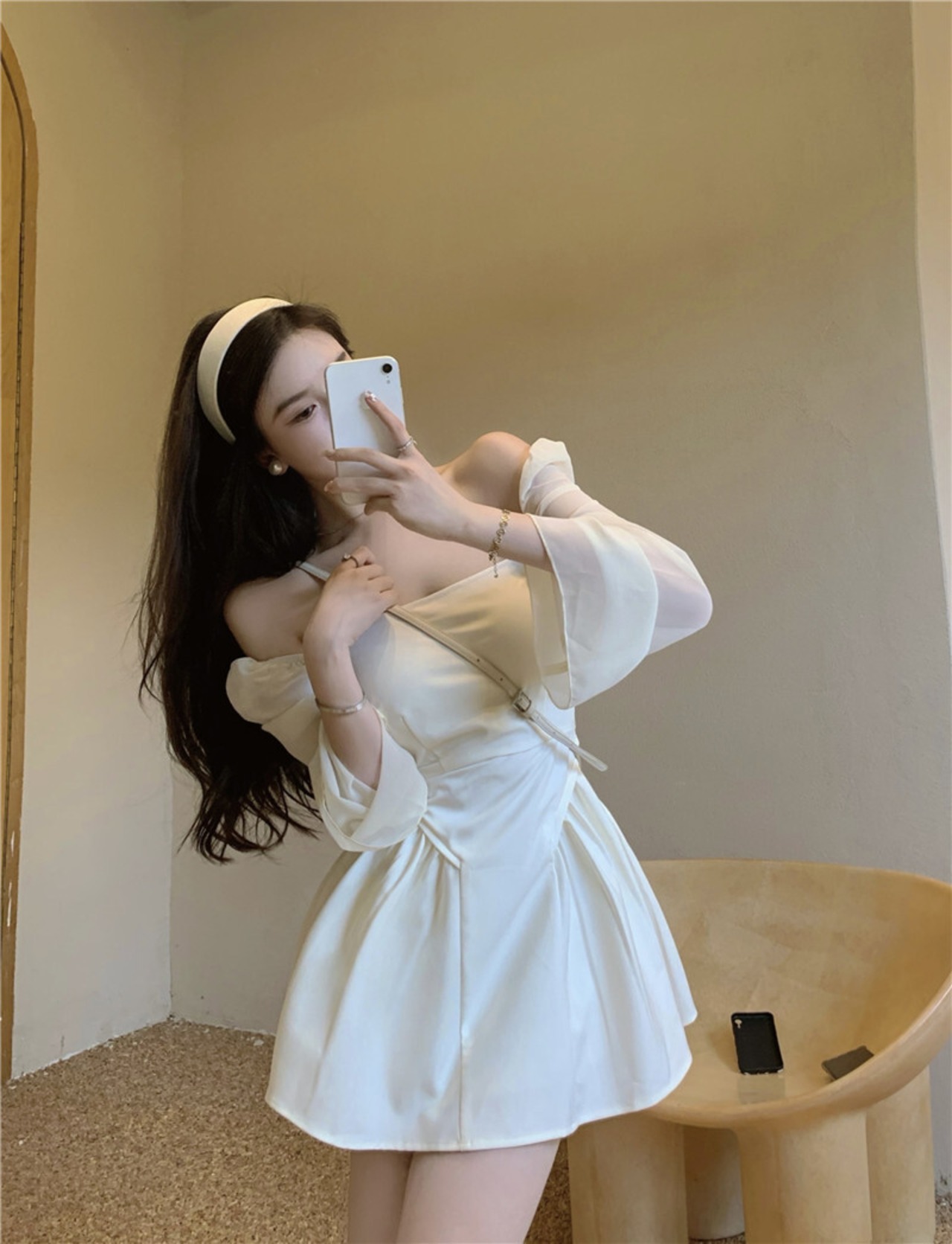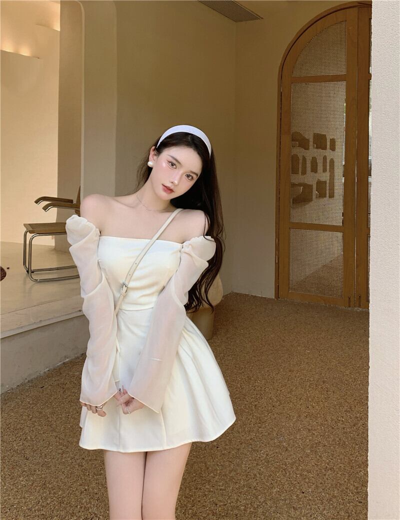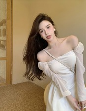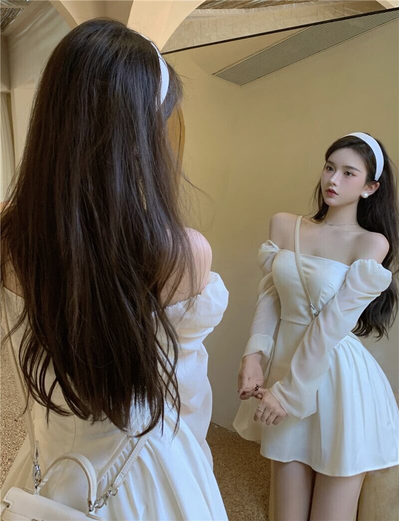 フランスの小さな白いドレス秋のドレス2021新しい女性のスーパーフェアリーパフスリーブセクシーなワンショルダーウエストスリミングドレス micat33644076338
