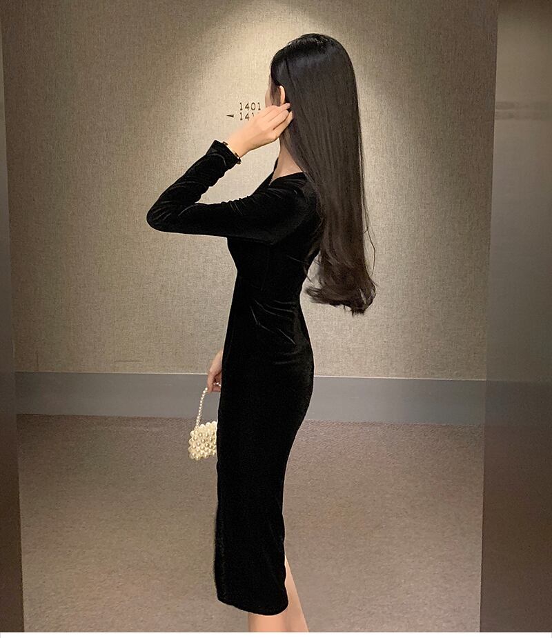 成熟したロイヤルシスタースタイルの女性の秋と冬の有名人の気質Vネックブラックゴールドベルベットスリムミドル丈ドレス micat68139196286