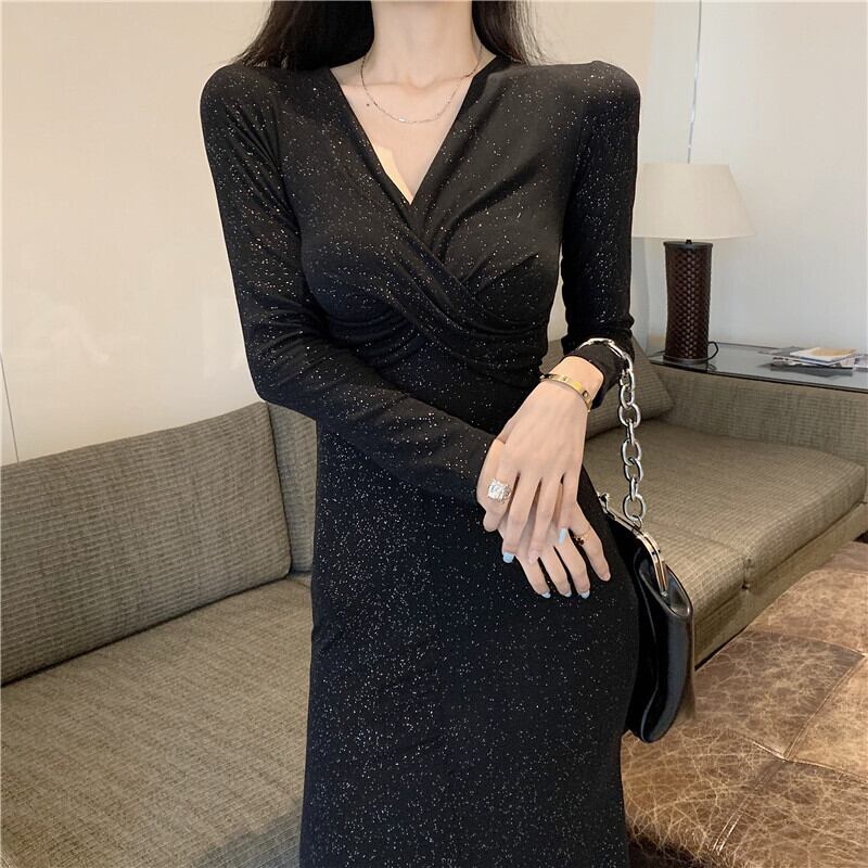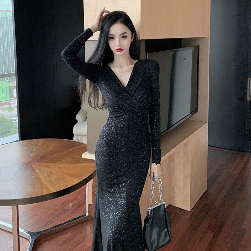 イブニングドレス、ロングスカート、女性の宴会、気質、光沢のある、金色の夜、セクシーなVネック、長袖、スリムなドレス micat76180317697