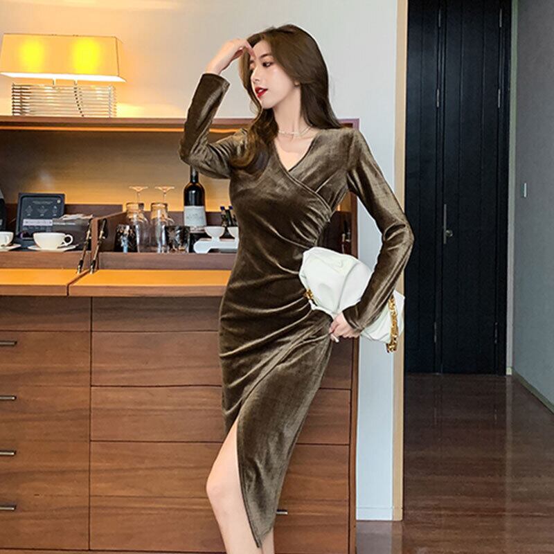 Gao Lengfan、成熟したインペリアル姉妹スタイルの婦人服秋の女性の気質スリムな痩身ゴールドベルベットミドル丈ドレス micat47784183054