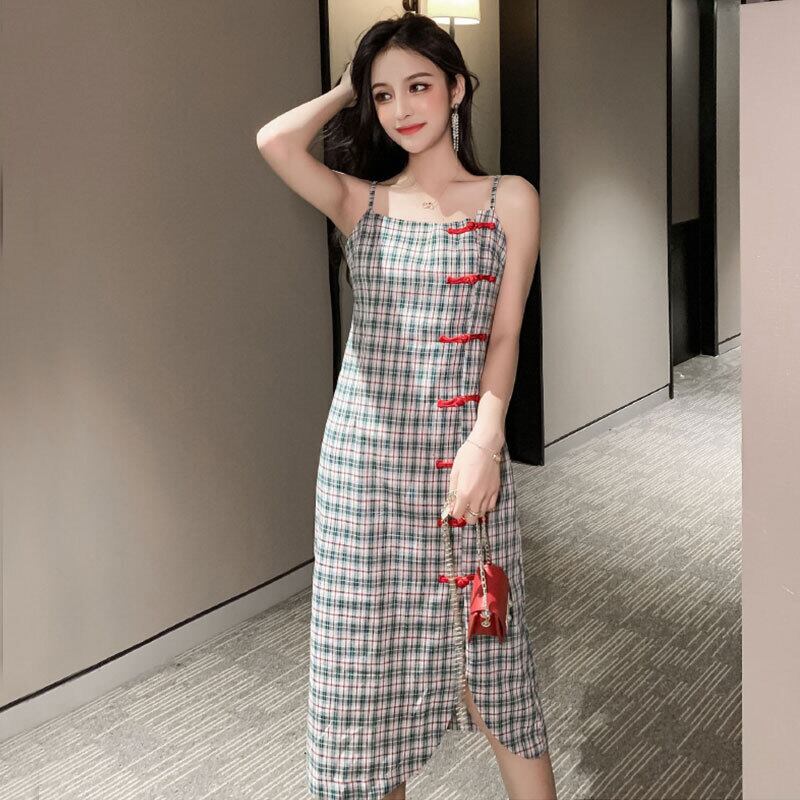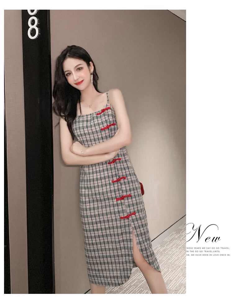 チェック柄スリングスカート女性夏フランス共和国スタイルレトロディスクボタン若いミドル丈改良チャイナドレス micat27338508230