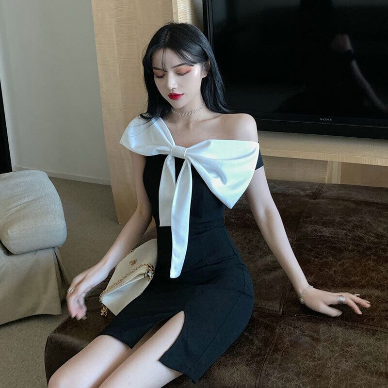 2021年夏新しい女性のネット赤いアンカーソルト甘い大きな弓セクシーなワンショルダーストラップレスドレス micat62417125925