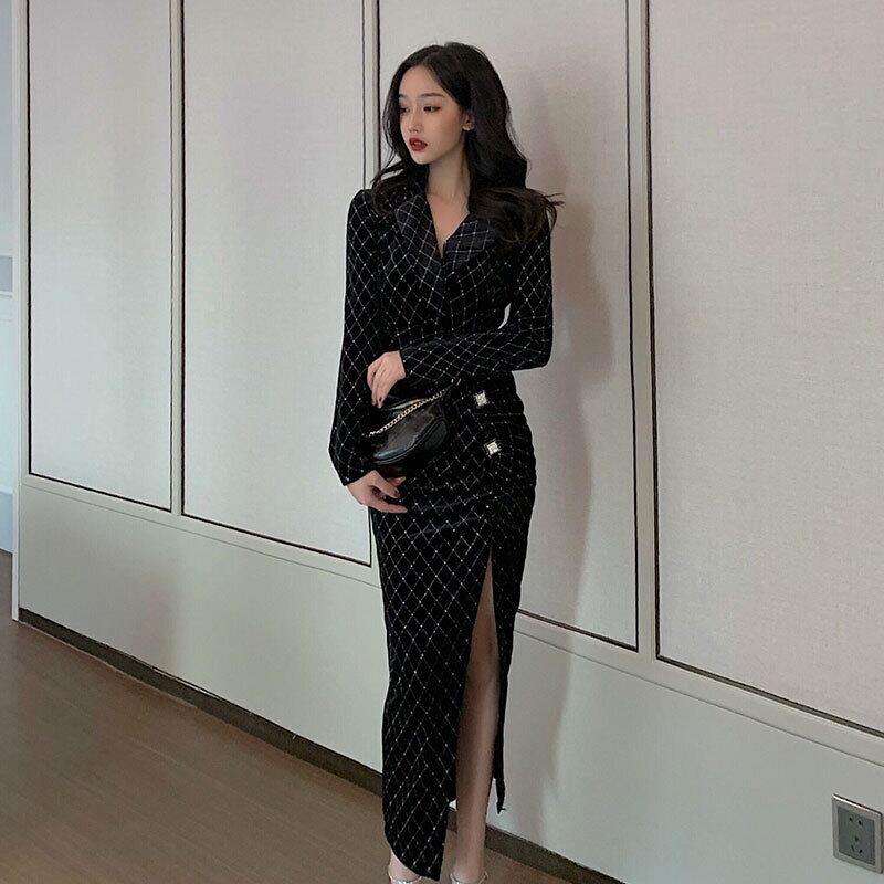 成熟したロイヤルシスタースタイルの女性の秋のスタイルの高級感のある社交界の名士の気質レトロなチェック柄のゴールドベルベットミドル丈ドレス micat4554607736