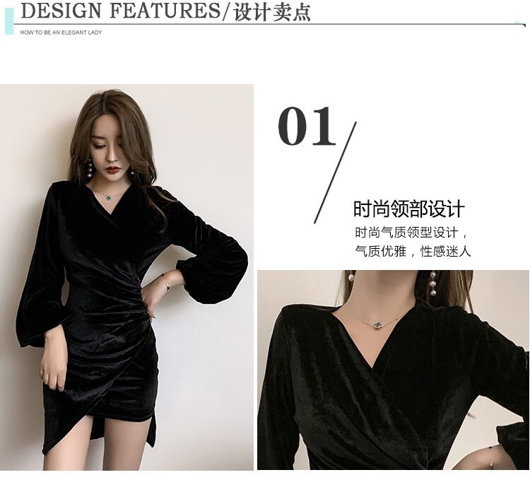 ナイトクラブの女性の秋の夜の作業服セクシーなVネックウエストスリミング長袖ゴールドベルベットドレス micat45346715523