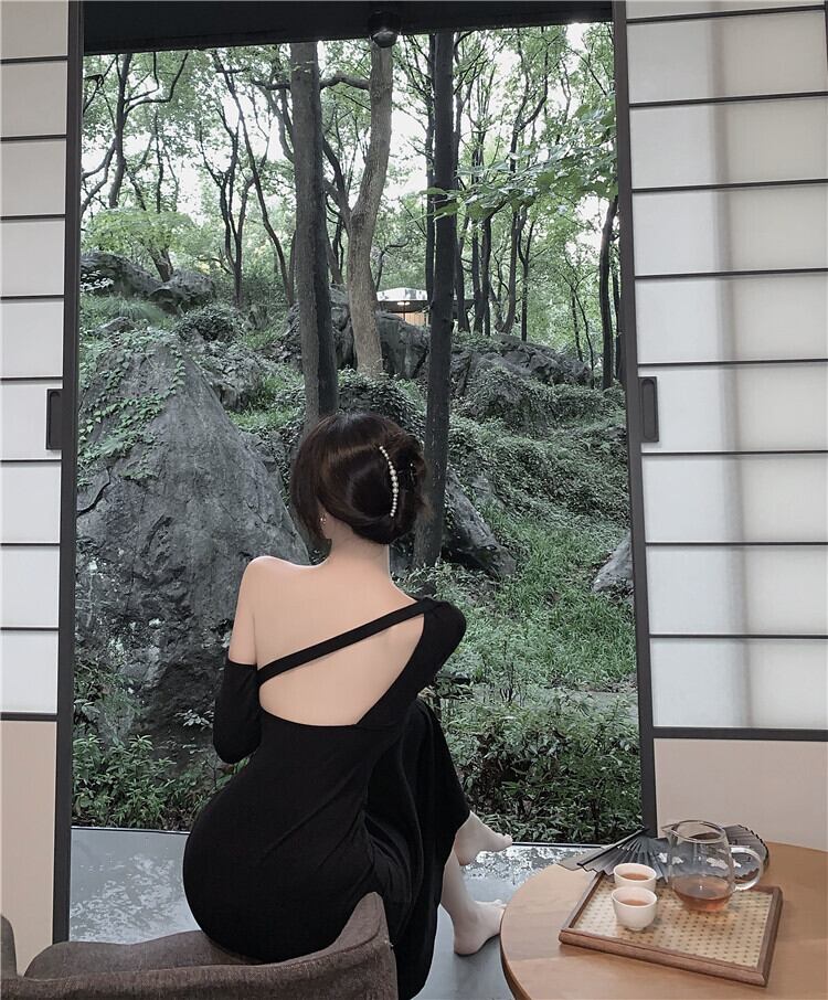 黒のイブニングドレスナイトクラブレディースナイトバンケット気質ハイエンドセクシーホルター長袖ミドル丈ドレス micat67061825009