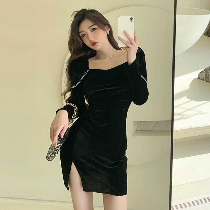 秋の婦人服2021年新しいフレンチリトルブラックドレスセクシーなスクエアネックチェーンデコレーションゴールドベルベットドレス micat90937109015