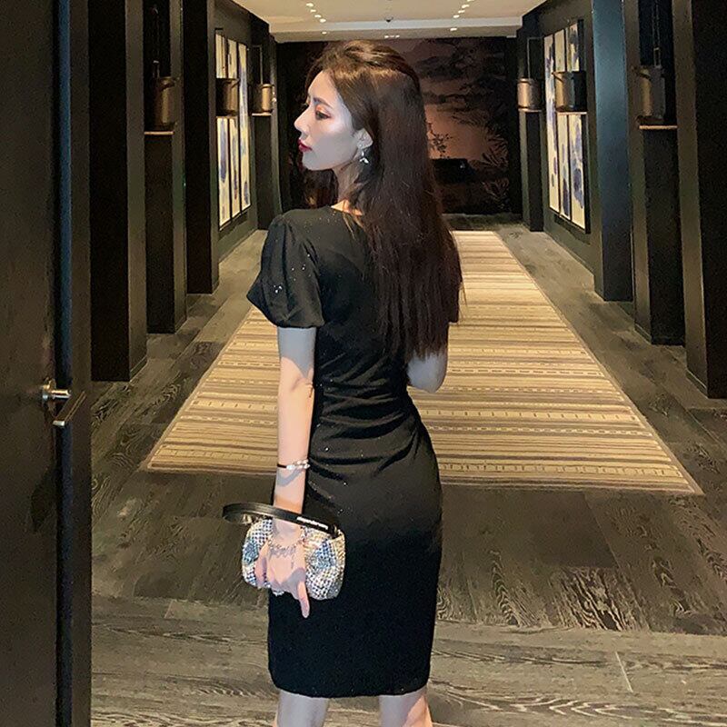 ナイトクラブの女性のイブニングドレス、光沢のある小さな黒いドレス、セクシーなスクエアネックのパフスリーブミドル丈のドレス micat70683160438