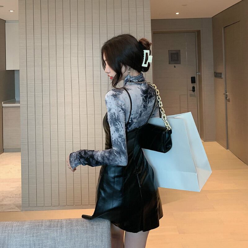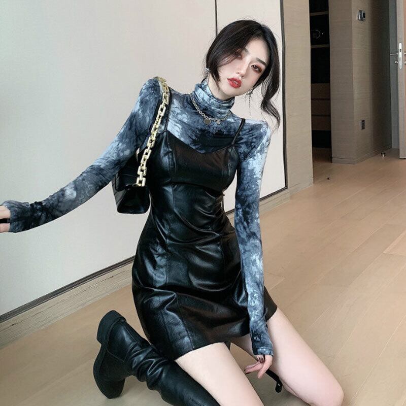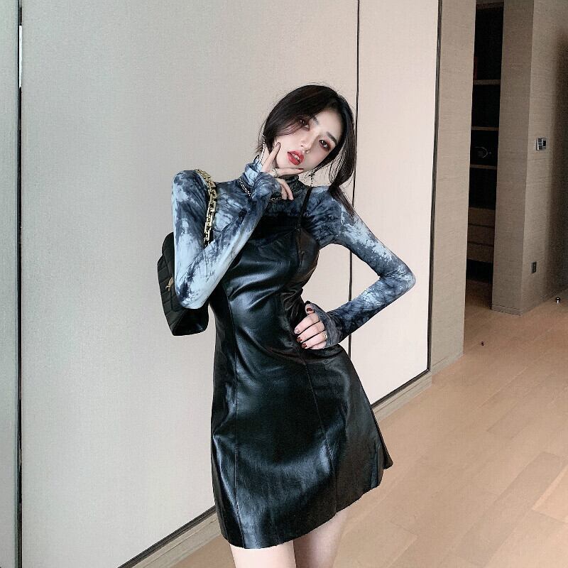 Gao Leng Yu JieFengスーツ女性秋の絞り染めボトミングシャツTシャツ+ PUレザースリングドレスツーピーススーツ micat67042893371