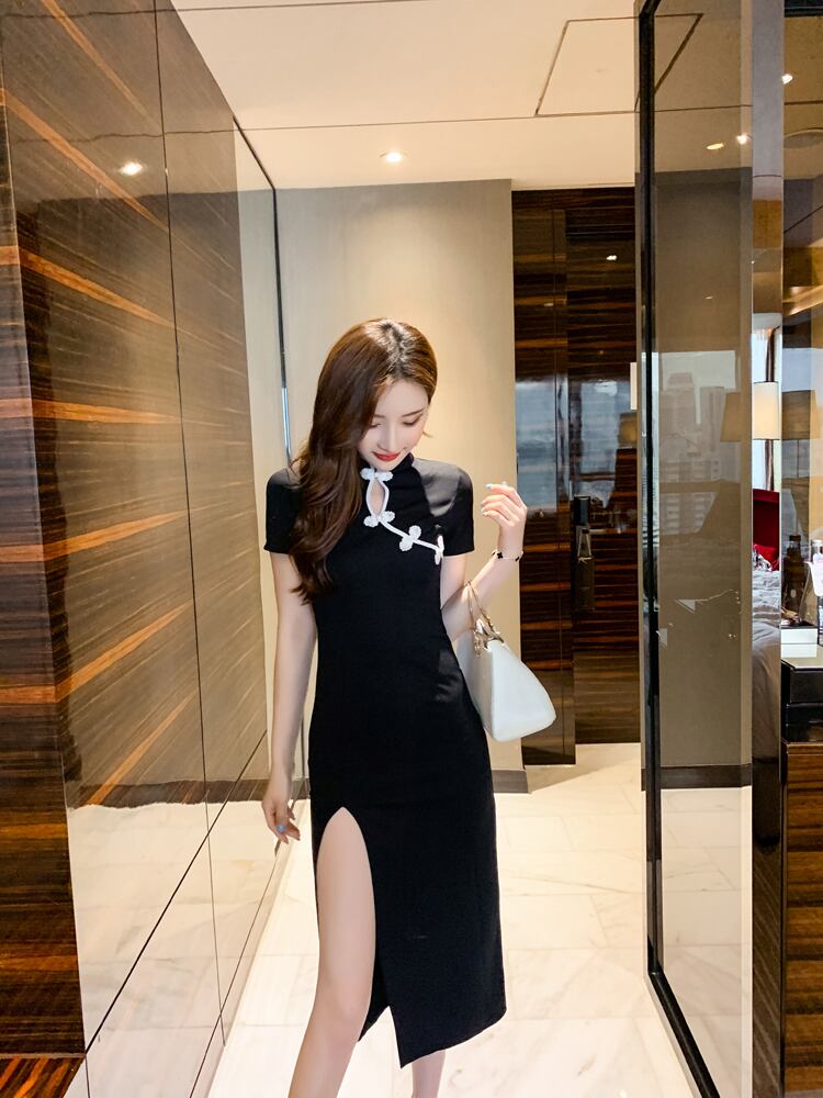 共和党スタイルのドレスイブニングドレス気質セクシーな自己修養ハイスプリットブラックミドル丈チャイナドレス改良版ドレス micat10249580536