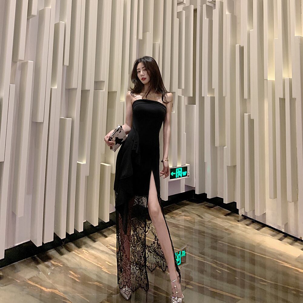 ロングイブニングドレス女性イブニングガス田気質スリムスリミングクイーンセクシーロングスカートワンショルダーチューブトップドレス micat46512256309