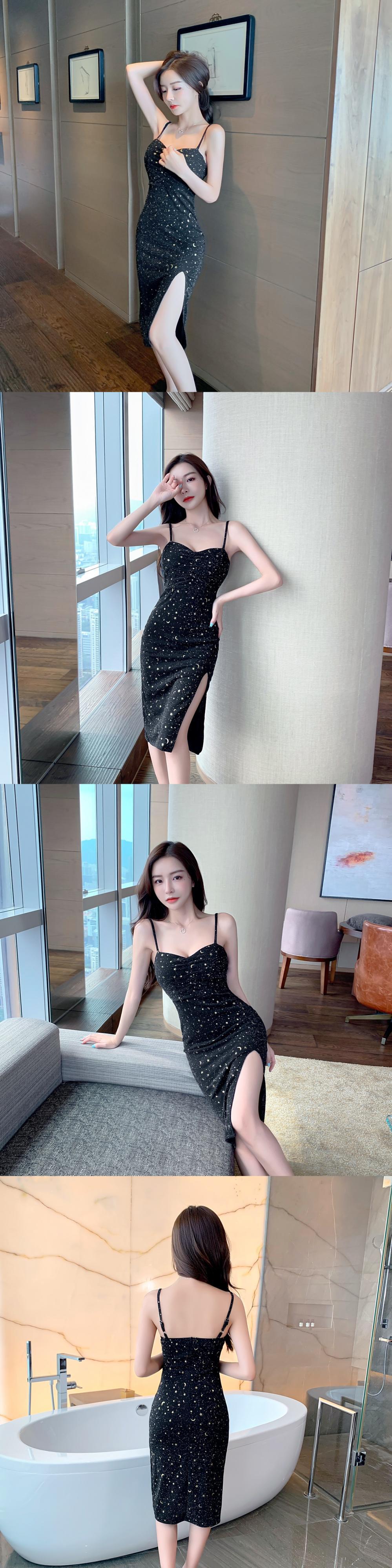イブニングドレス、ナイトクラブ、レディースドレス、光沢のあるシルクブロンズバンケットの気質、セクシーなスプリットミドル丈サスペンダードレス micat86979323141