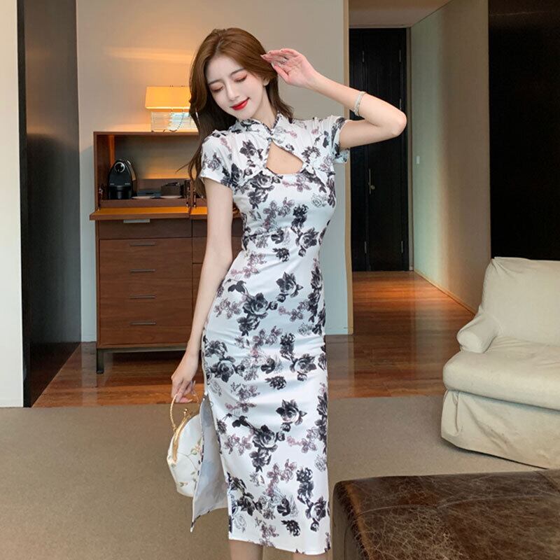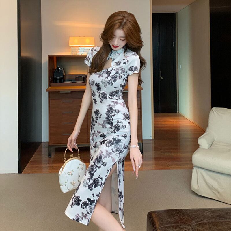 チャイナドレス女性夏改良版ヤングスタイル気質レトロチャイナスタイルプリント半袖スリムミドル丈ドレス micat44553429981