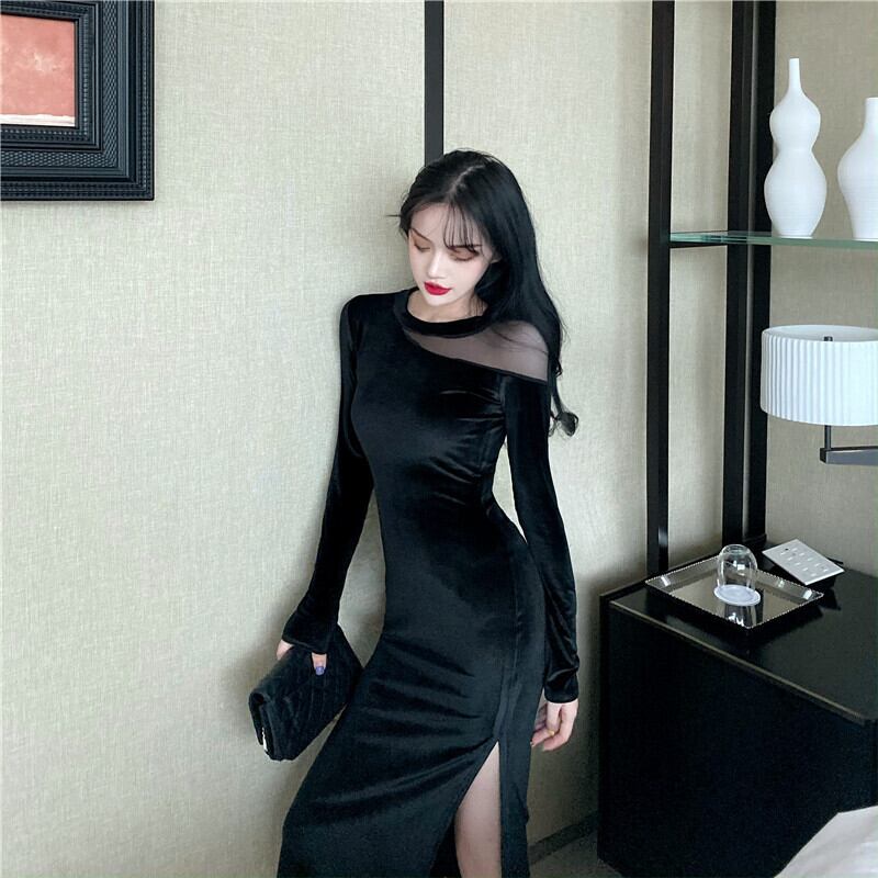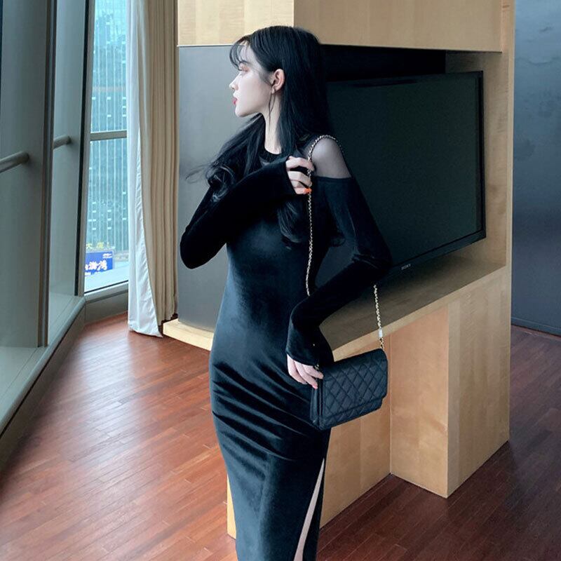 黒のイブニングドレス女性の秋と冬の宴会気質セクシーなメッシュステッチ長袖ミドル丈ゴールドベルベットドレス micat2984979811