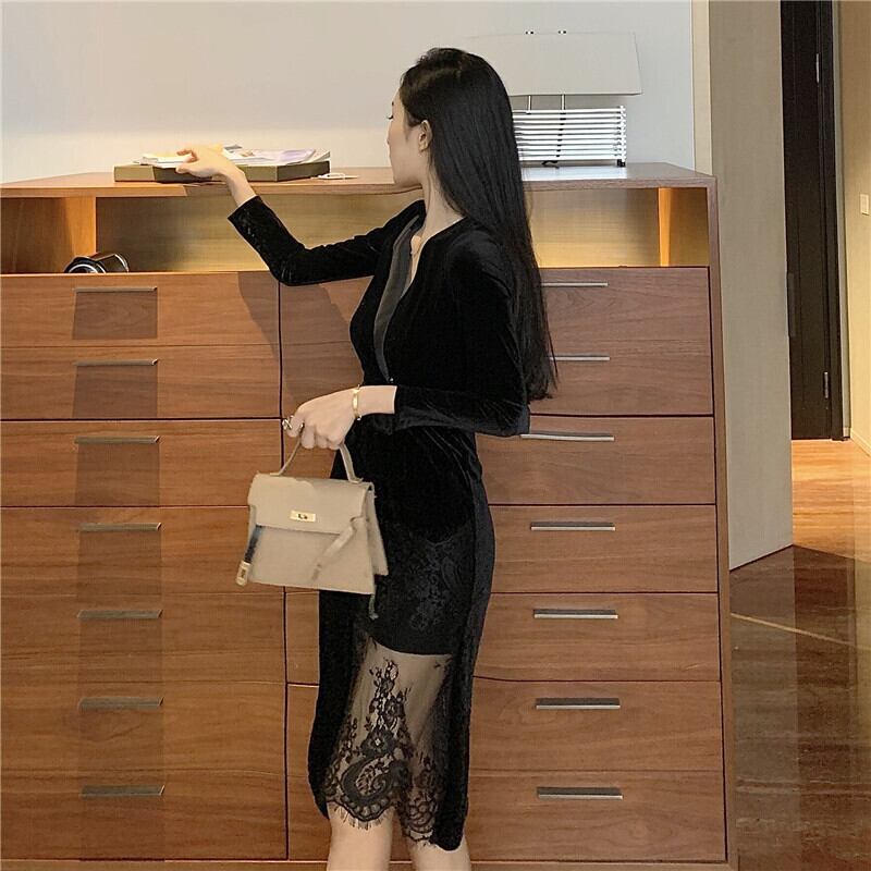 2021年秋新しい女性の高い寒さYujieFengyang気質ゴールドベルベットレースステッチスーツ襟ドレス micat20394167257