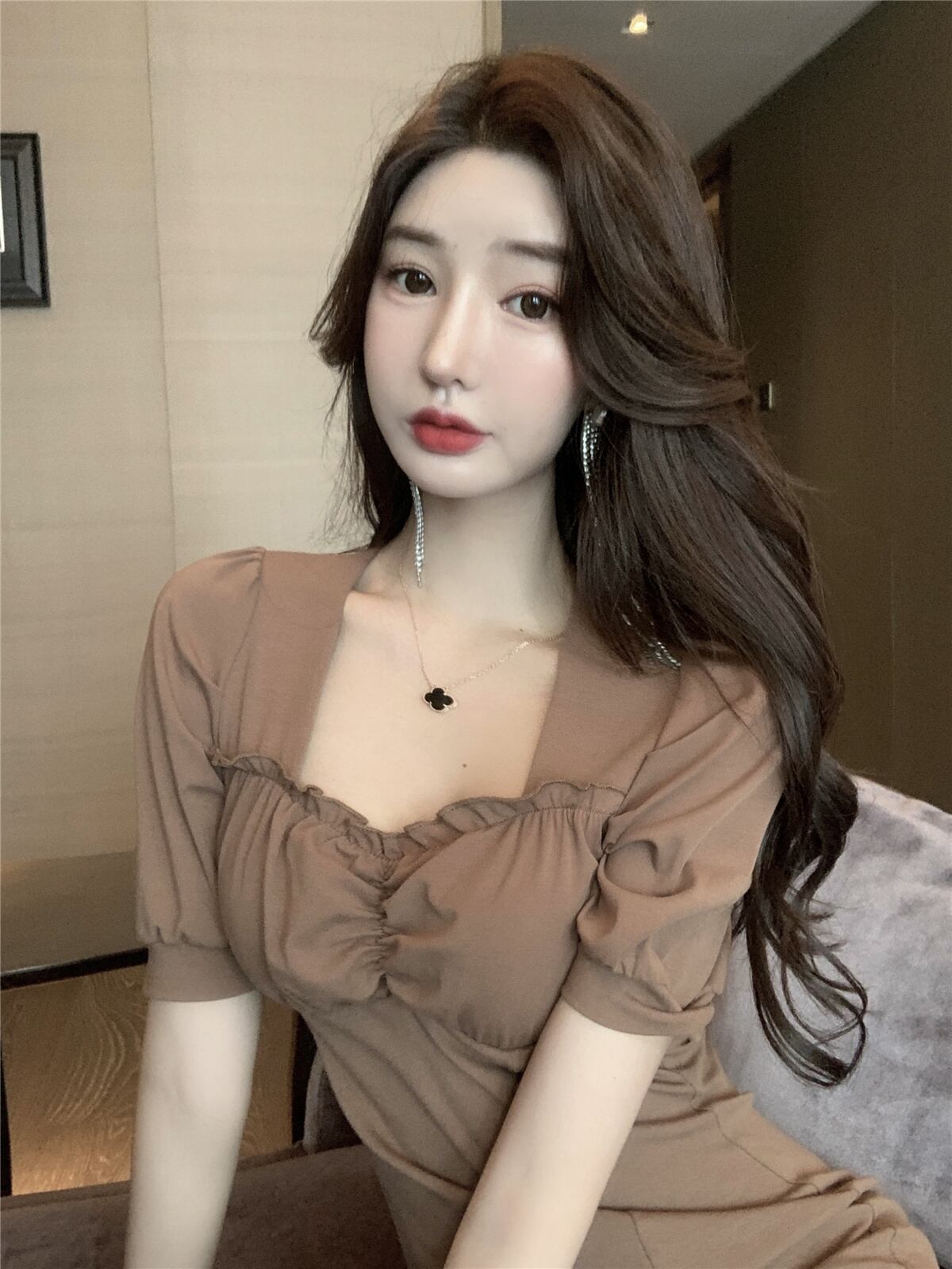 2021年夏の女性の-cl気質フレンチパフスリーブスクエアネックスプリットミッドロングドレス micat82259400092