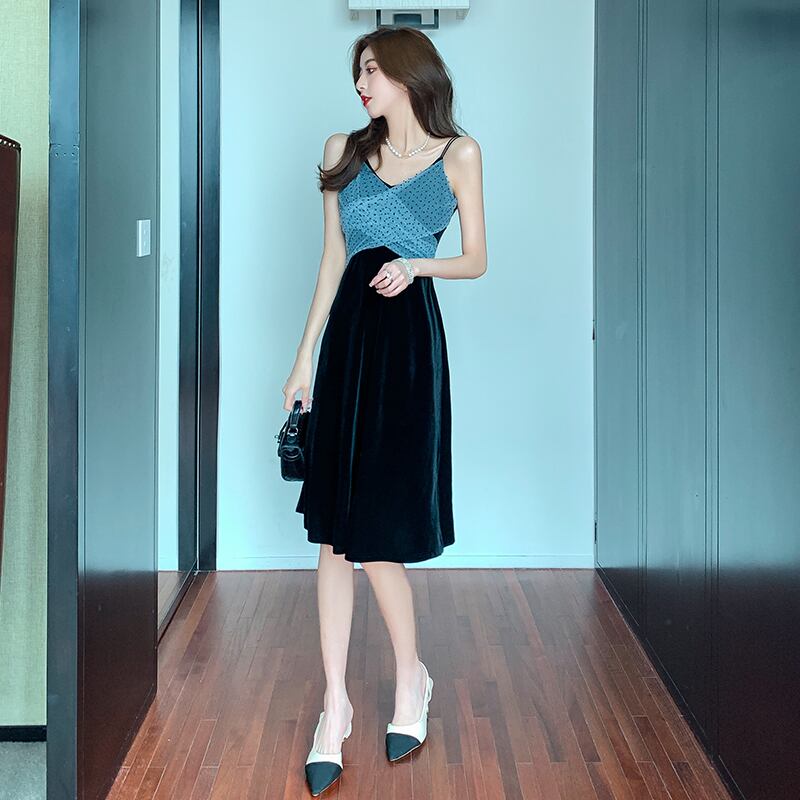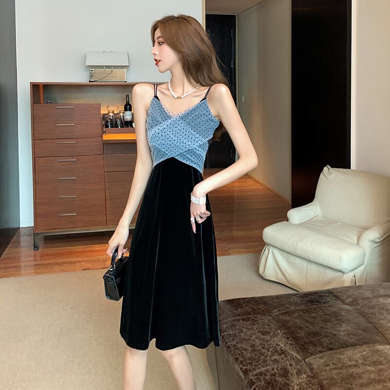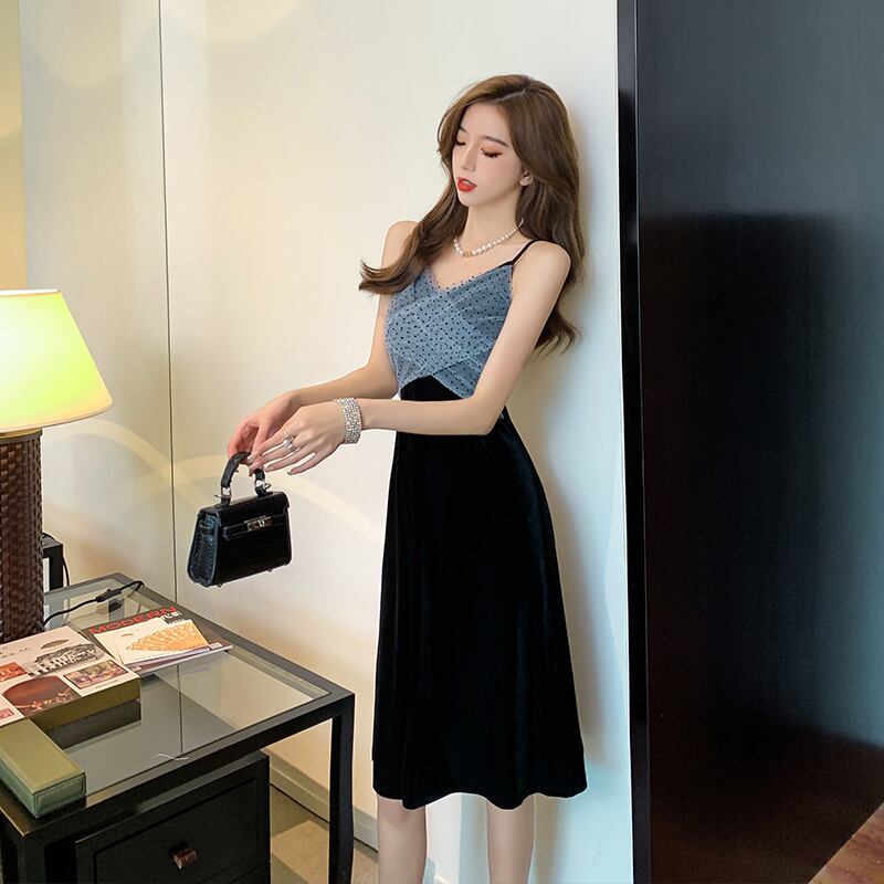 イブニングドレスナイトクラブレディースナイトセクシーな水玉メッシュステッチゴールドベルベットミドル丈サスペンダードレス micat8195425339