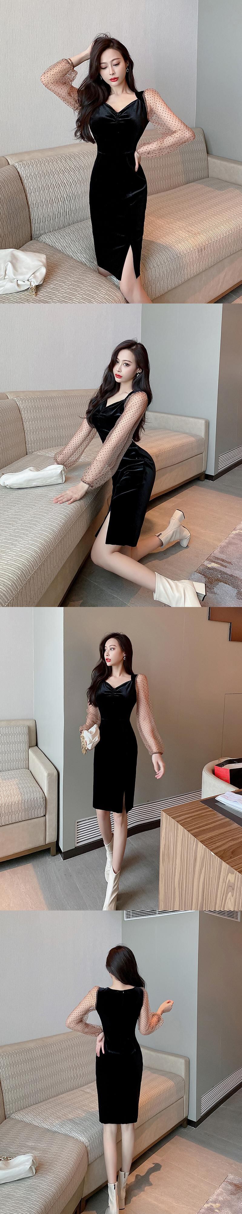 秋の婦人服2021年新作レディースフレンチ高級感のある気質スクエアネックステッチ水玉メッシュワンピース micat51975792632