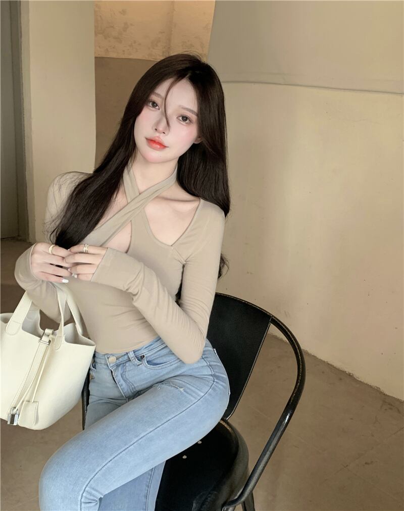 シックな初秋のトップデザインセンスニッチシックな純粋な欲望セクシーな中空クロスハンギングネックストラップレスTシャツ micat4669205749
