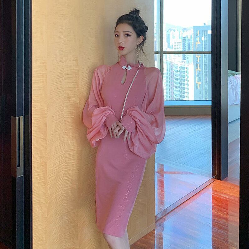 2021年秋新しい女性の若いモデルファッショナブルなスパークリングシフォンステッチランタンスリーブ改良チャイナドレス micat39081790354