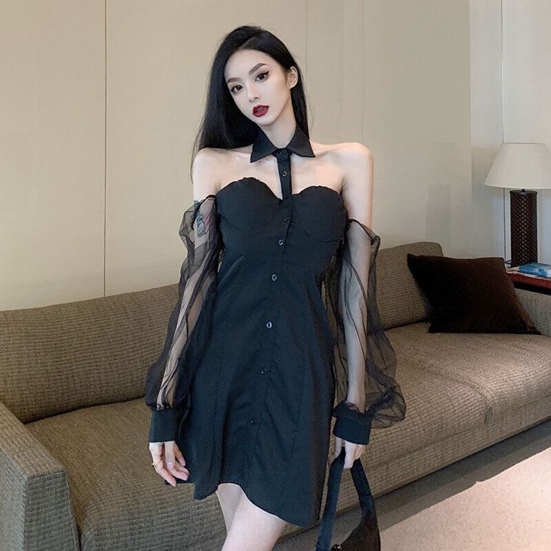 ネットレッドアンカーコスチュームポジェニックセクシースーパーフェアリーネットヤーンランタンスリーブシャツカラーストラップレスチューブトップハンギングネックドレス micat46534192684