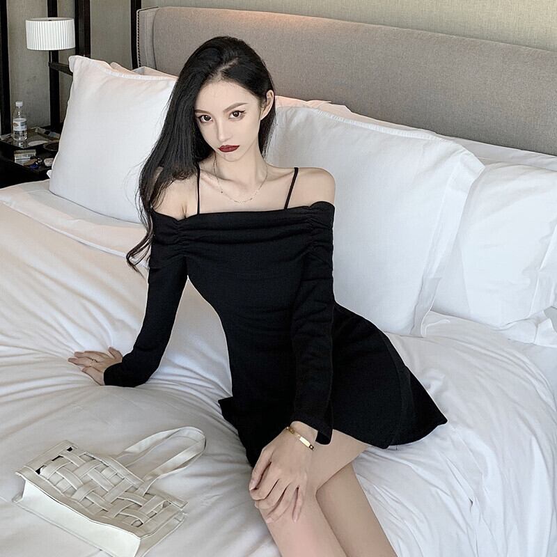 2021年秋新しい女性の気質ワンショルダーウエストスリミングAラインスカートブラック長袖オフショルダードレス micat21901188844