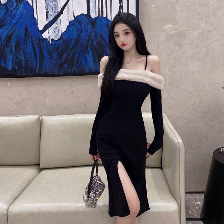 イブニングドレス女性の秋と冬のナイトクラブの夜のセクシーなワンショルダー長袖スリムフィットミドル丈サスペンダードレス micat763892289