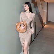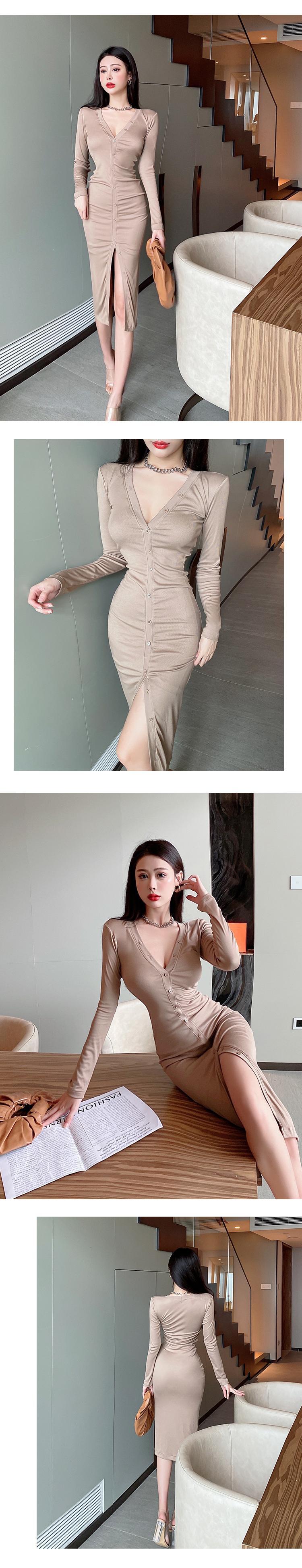 成熟したロイヤルシスタースタイルの女性の秋の気質セクシーなローカットディープVネックスリムミドル丈インナーベースドレス micat56310327215