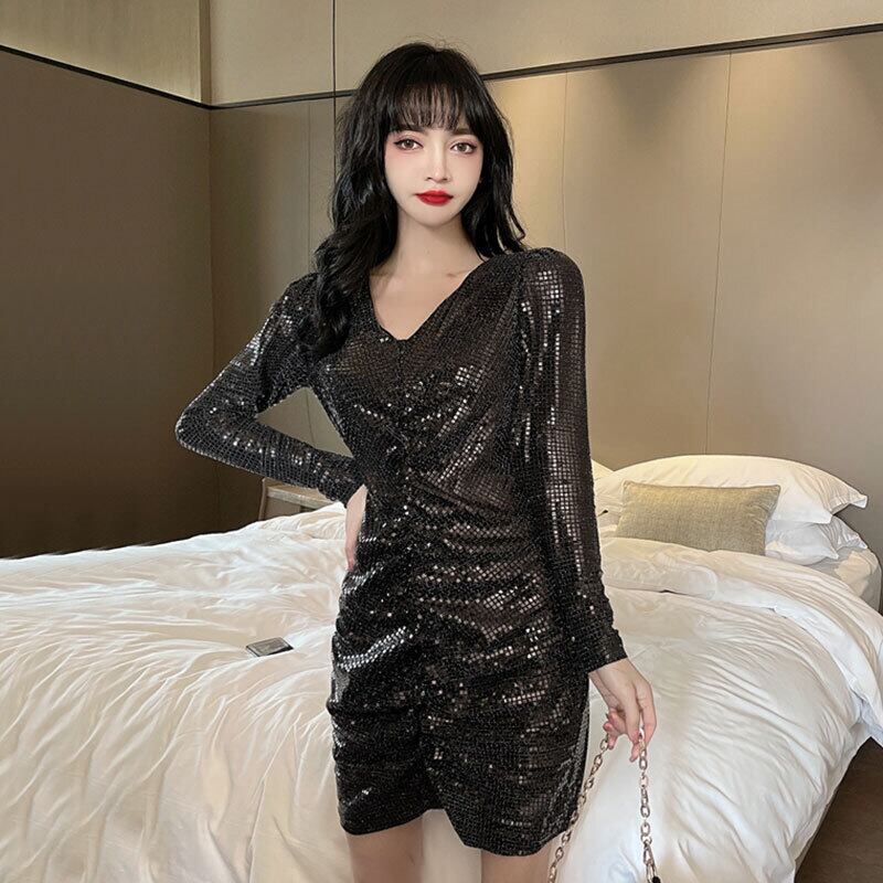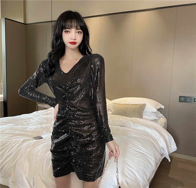 ナイトクラブレディースナイトワーク服バージャンプディシャイニーセクシーVネック長袖ヒップドレス micat99194651882