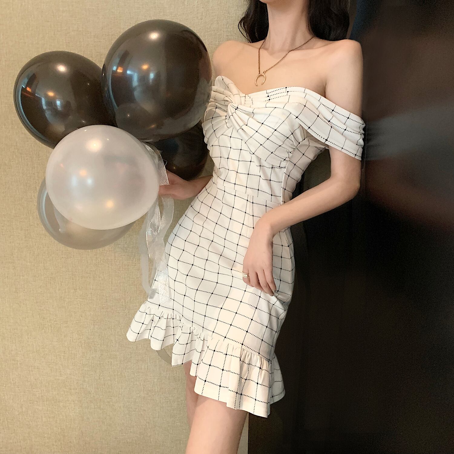 'フレンチミニドレス、フェアリーシリーズ、ショートバンケットウエスタン気質、セクシーなワンショルダーチェック柄フィッシュテールドレス micat44147893733