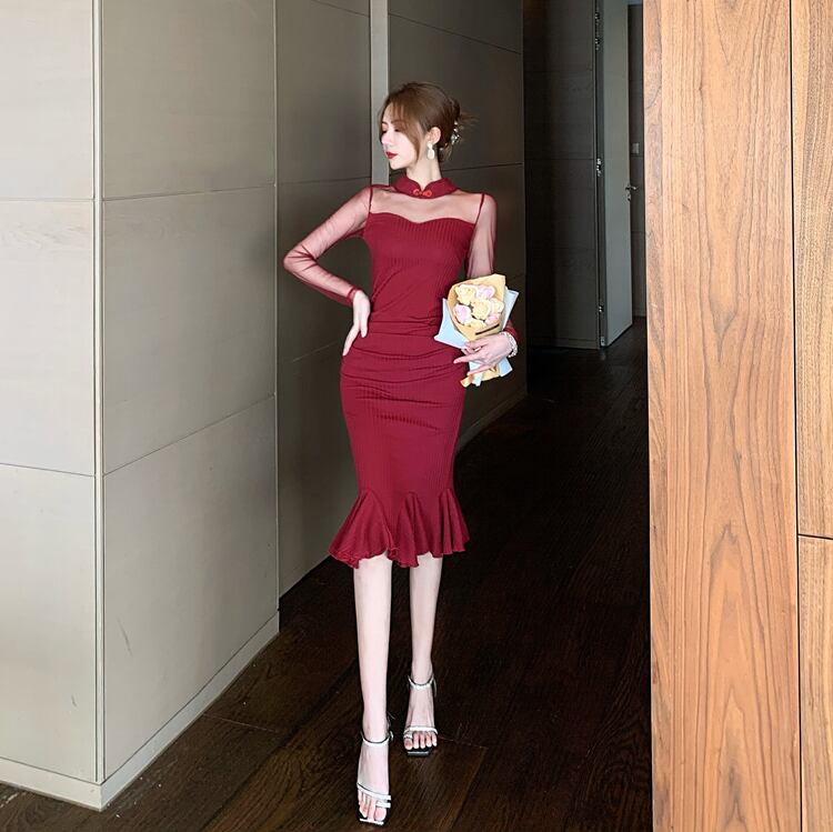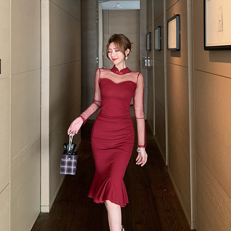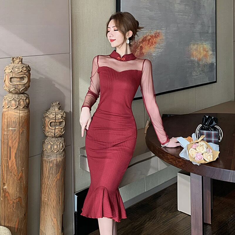 初秋の新しい女性の2021年の女性の気質エレガントなセクシーなメッシュステッチミドル丈フィッシュテールチャイナドレス micat39297399427