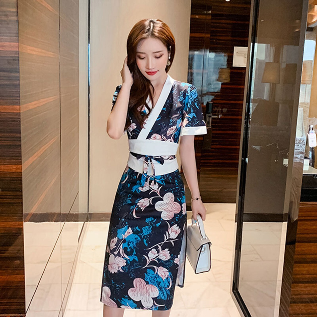 夜勤服ネットセレブライブ放送アンカー服女性気質セクシーVネックミドル丈スプリット着物ワンピース micat50526732165