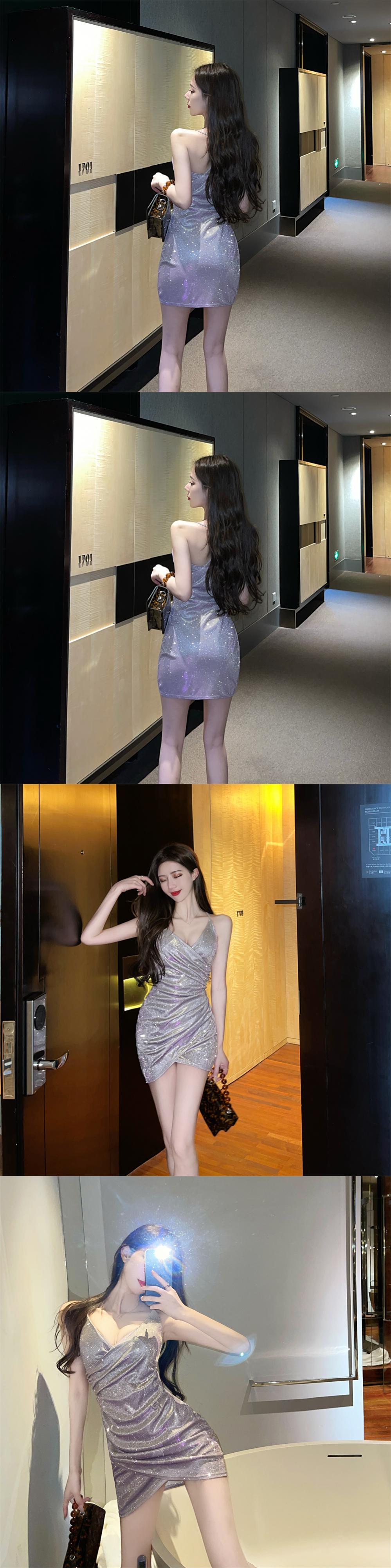 イブニングバンケット気質ミニドレスショートスパークリングシャイニーシルクナイトレディースセクシーローカットディープVネックサスペンダードレス micat75665751812