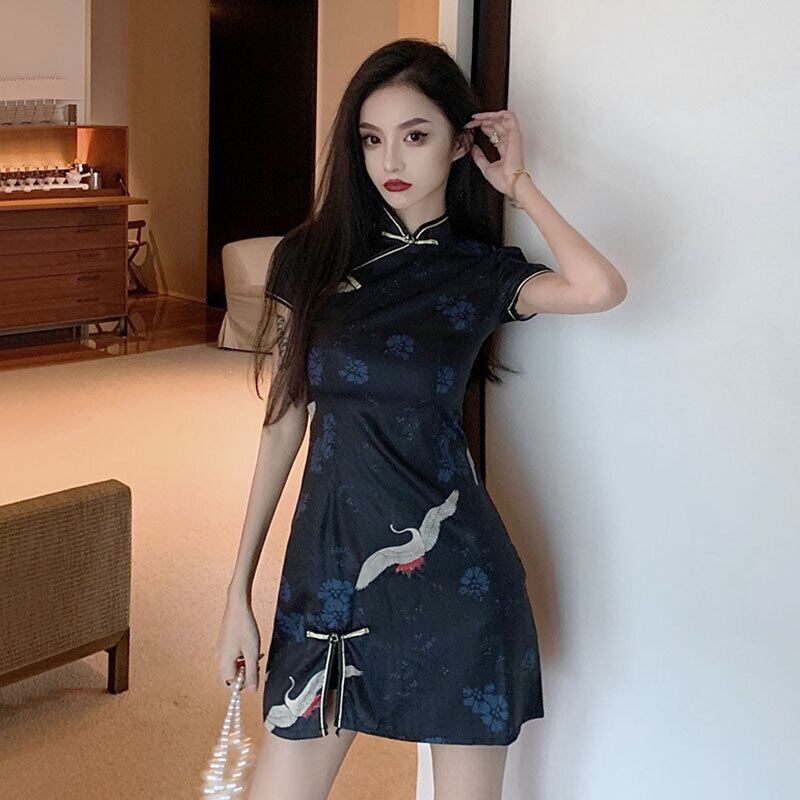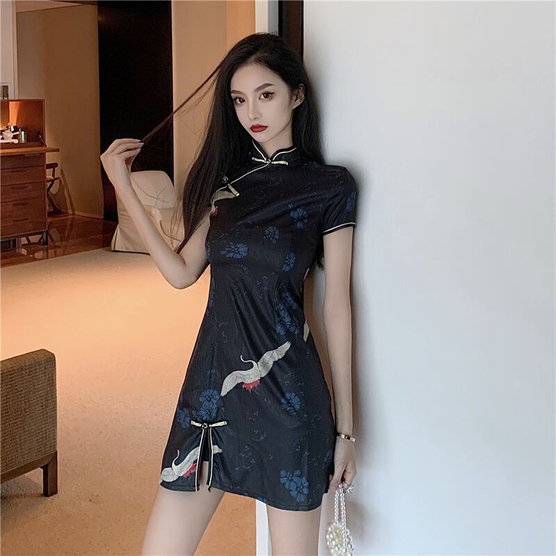 スタイルチャイナドレスは夏の若いレトロな中国風クレーンプリントセクシーなスリムバッグヒップドレスを改善しました micat6000416606
