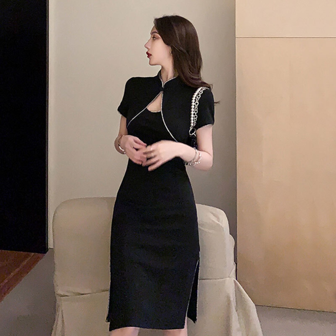 黒のチャイナドレスは2021年夏に改良された新しい気質セクシーな中空スリムショートスプリットヒップドレス micat530369083
