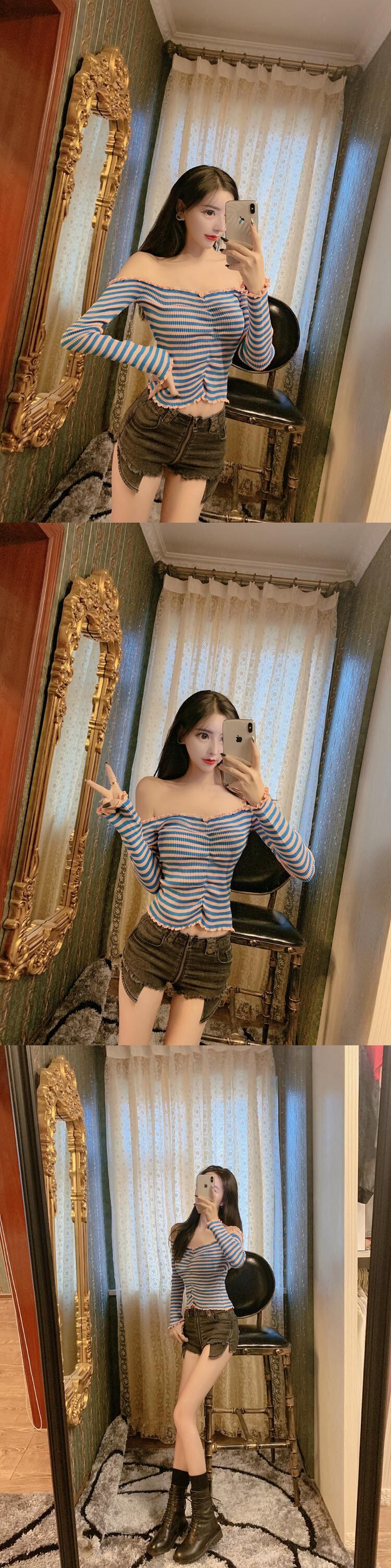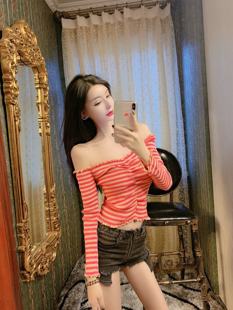 生きている服、ポジェニックな女性のアンカーコスチューム、セクシーな気質、ワンネックの短いストライプのセーター、オフショルダーのトップ micat62048906594