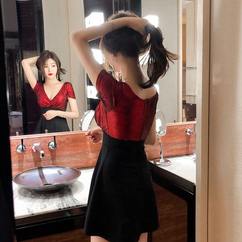 ナイトクラブの女性のオーバーオールスパークリング明るいスプライシング気質セクシーなVネックの薄いパフスカートナイトクラブドレス micat91538830987