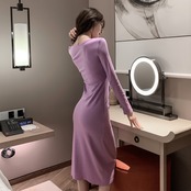 2021年初秋の新しい女性の気質の女神ファンセクシーなローカットディープVネックスリム長袖ミドル丈ドレス micat44086031920