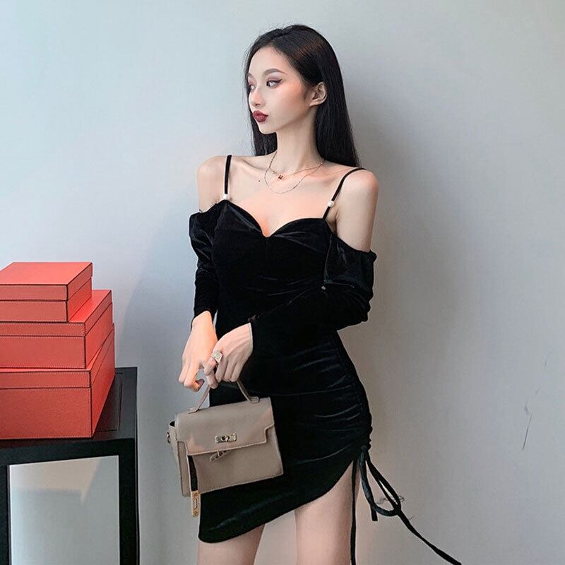 ナイトクラブの女性の秋と冬の夜の気質セクシーなローカットVネックワンショルダーゴールドベルベット長袖サスペンダードレス micat52192858425