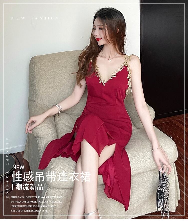 イブニングドレスイブニングドレスレディースハイエンドバンケット気質セクシーローカットディープVネックホルターミドル丈サスペンダードレス micat18057845657