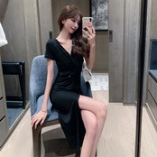 ナイトクラブバーの女性の有名人のイブニングドレス光沢のある小さな黒いスカート気質セクシーなVネックミドル丈ドレス micat25881305226