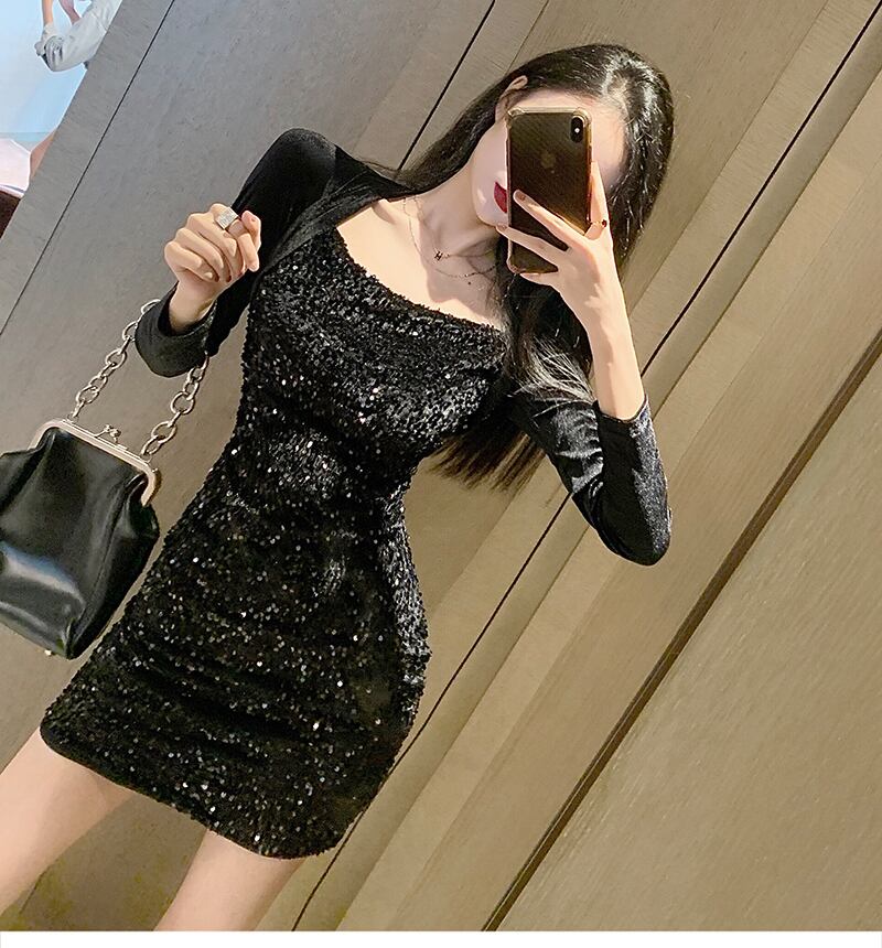 ナイトクラブレディース秋冬ナイトバーまばゆいスパンコールセクシースクエアネックベルベット長袖バッグヒップドレス micat69398532050